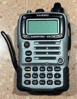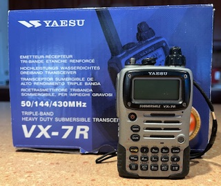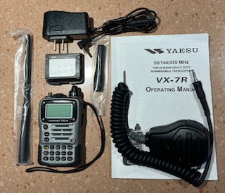 Yaesu Handheld Transceiver: VX-7R — Like new, three-band Yaesu VX-7R HT radio. Excellent condition. Includes optional waterproof, corded Yaesu microphone. Selling for $175. (k4rqt)