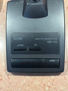 ICOM Desk Microphone: SM-20 — Unidirectional, electret microphone designed for base station operation. Features Up-Down tuning (on compatible ICOM transceivers). Switch for PTT (push to talk) and also a lock feature. On the bottom is a gain adjustment and a Low Cut switch. Mic powered from the transceiver. The mic cables terminate to a standard 8 pin mic plug. Works with the 718, 746, 746Pro, 756, 756 Pro, 756ProII, 756ProIII, 775, 781, 820, 821, 910H and 920. Can also be used with the 706 series with the addition of the optional OPC-589 mic adapter cable. Selling for $99 or best offer. (k4rqt)