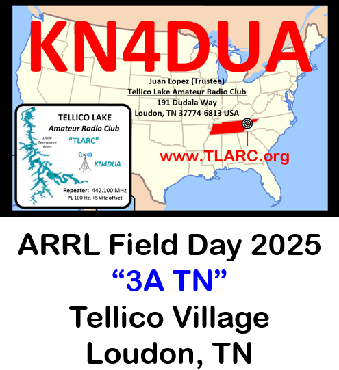 FD 2025 on June 28th was a success for TLARC. We set up our Command Post at the Tellico Village Volunteer Fire Station, the same place where we have our monthly meetings and we had three transmitter sites set up, two of which ran 24 hours straight on battery power. We even recharged batteries using solar panels. We had five temporary antennas installed out in the grassy field area.