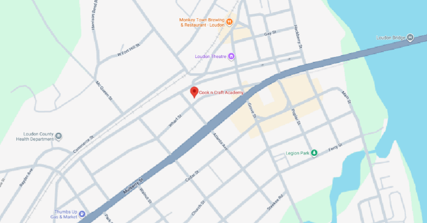 LOCATION: The Cook ‘n Craft Academy is in downtown Loudon at 418 Wharf Street, one block north of TN Route 11 (Mulberry Street) and 2 blocks west of the Loudon town fountain and Tic Toc Ice Cream.