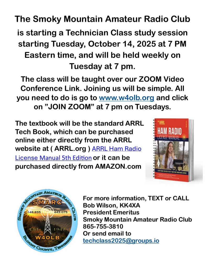Just a friendly reminder that the SMARC Technician Class Study class starts Tuesday, October 14, 2025 at 7 pm! The online class will be held on ZOOM video conference.